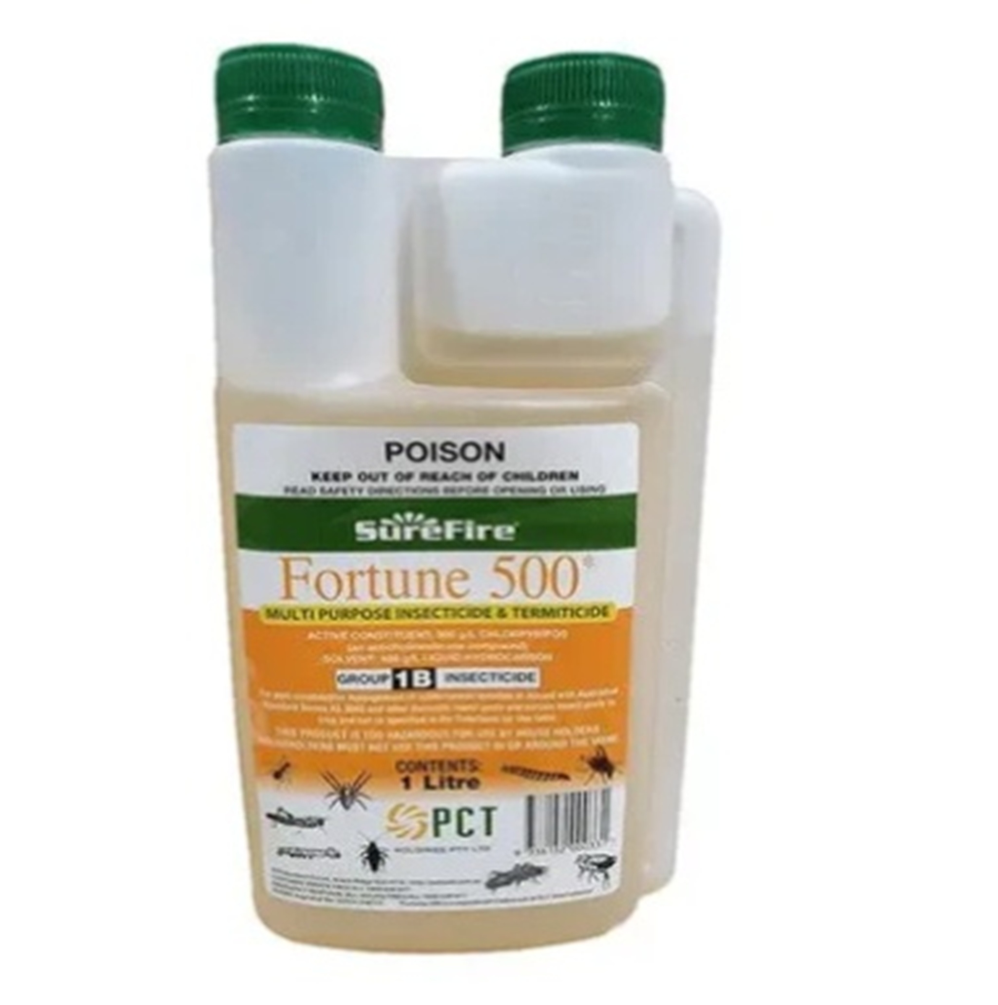 SureFire Fortune 500 EC is a high-performance, professional-grade insecticide and termiticide formulated with 500 g/L Chlorpyrifos in an emulsifiable concentrate (EC) base. Designed for professional pest controllers, agricultural managers, and commercial operators, it offers broad-spectrum pest control with long-lasting residual effects. Whether you are protecting a building from termite attack or managing insect pests in turf, crops, and ornamental landscapes, SureFire Fortune 500 EC delivers proven, reliable results in some of Australia’s harshest pest environments.